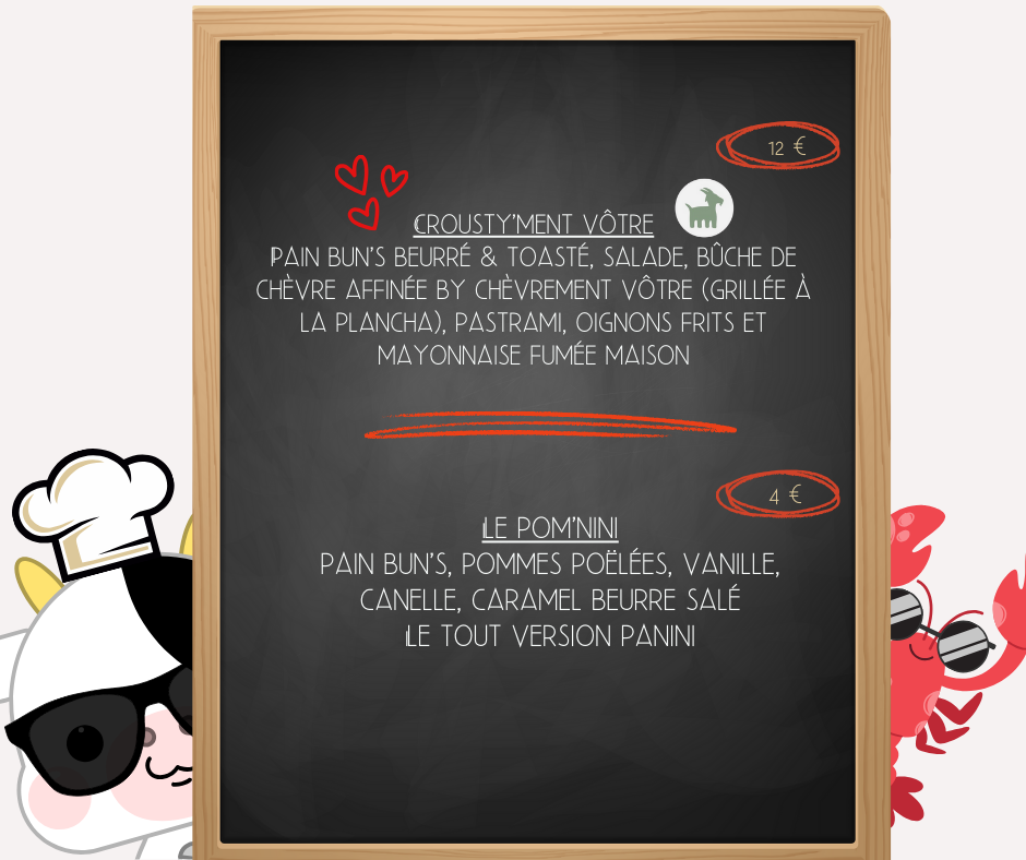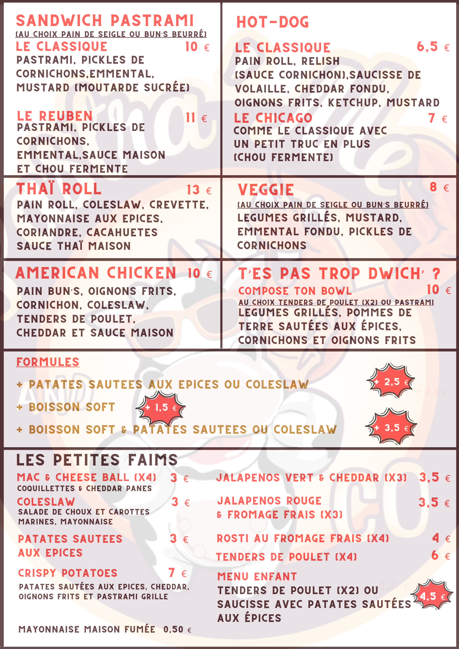 Nous proposons des sandwichs nord américain autour du pastrami, du homard (selon les saisons) et des Hot-Dog.