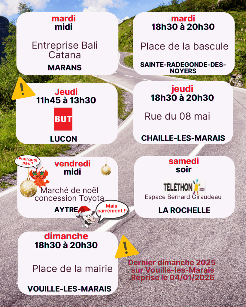 🚚 Pour savoir exactement où nous serons prochainement, n’hésitez pas à regarder ci-dessous : on vous y indique nos emplacements à venir chaque semaine !